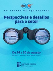 Os professores e alunos do Técnico e Engenharia de Aquicultura convidam a comunidade para a VII Semana da Aquicultura do Campus Morada Nova que será realizada entre os dias 26 e 30 de agosto de 2025. Sob o tema "Desafios e Perspectivas para o Setor" serão promovidas palestras e debates com profissionais convidados. Também ocorrerá a II Mostra de Trabalhos Científicos onde pesquisadores poderão apresentar suas pesquisas ao público. A Semana da Aquicultura é realizada para que todos os que têm interesse na área possam trocar ideias e experiências.