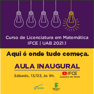 Neste sábado, 13 de março, às 9h da manhã, acontece a aula inaugural do semestre 2021.1 do curso de Licenciatura em Matemática ofertado pela Diretoria de Educação a Distância do IFCE.