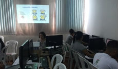 Oficina sobre Entrevista Profissional e Elaboração de Currículo, sendo ministrada pela psicóloga Cybele Nogueira, no laboratório de informática do campus Guaramiranga.