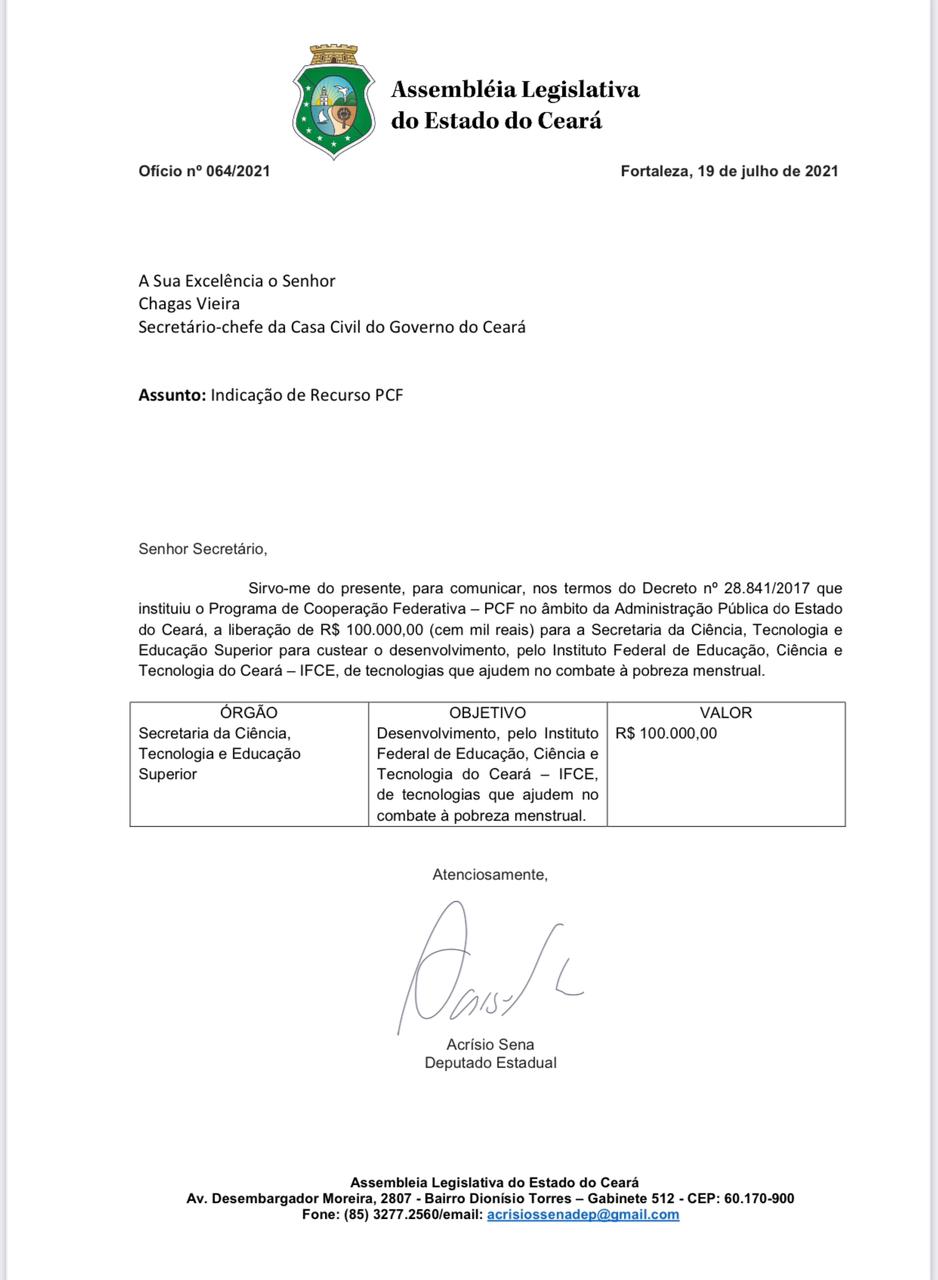Numa reunião recente da gestão na Assembleia Legislativa do Ceará, o deputado estadual Acrísio Sena (PT) se comprometeu a destinar 100 mil reais através de emenda parlamentar "para produção de tecnologia de combate à pobreza menstrual no Ceará, com a capacidade de produção própria de kits para as pessoas em situação de vulnerabilidade social".