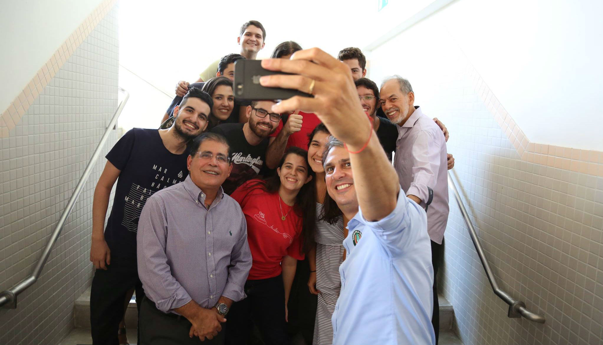 Camilo Santana, Virgílio Araripe e Inácio Arruda posam para foto com alunos