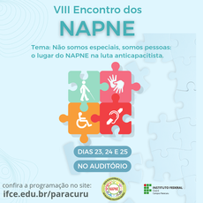 "Não somos especiais, somos pessoas: o lugar do NAPNE na luta anticapacitista": esse é o tema do VIII Encontro dos NAPNEs, que reunirá os Núcleos de Acessibilidade às Pessoas com Necessidades Educacionais Especificas dos diversos campi do Instituto no campus de Paracuru no período de 23 a 25 de novembro. O evento contará com três dias de palestras, exposições, Grupos de Trabalho, vivências e apresentações culturais, abordando o grande papel social dos Núcleos na instituição e seu papel social na luta pela inclusão das pessoas com deficiência. O Encontro dos NAPNEs acontece anualmente com a proposta de ser itinerante, tendo sido sediado em distintos campi do Instituto.