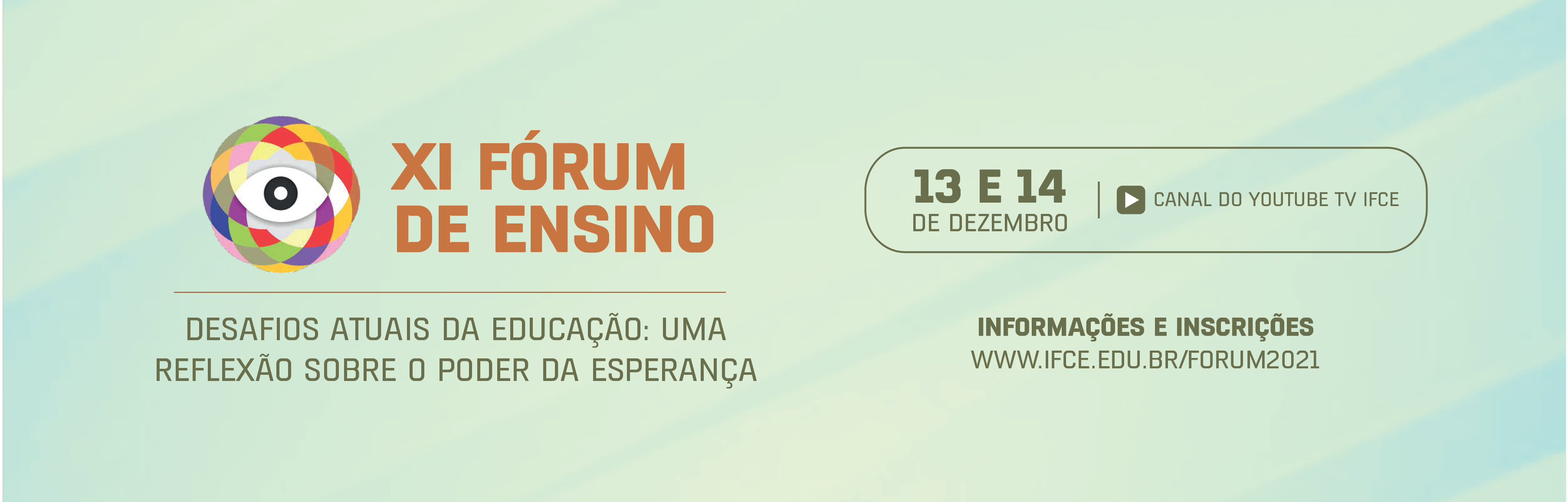 O Instituto Federal do Ceará – IFCE convida servidores(as), alunos(as) e comunidade externa para o XI Fórum de Ensino, que será realizado on-line nos dias 13 e 14 de dezembro de 2021, das 14h às 17h.