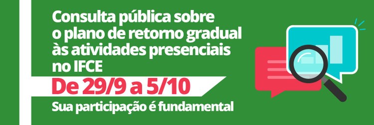 No entanto, antes de finalizar o Plano de Retorno Gradual às Atividades Presenciais no IFCE, a instituição vai ouvir a comunidade acadêmica, no período de 29 de setembro a 05 de outubro, por meio de uma consulta pública que pode ser respondida pelo formulário disponível AQUI.