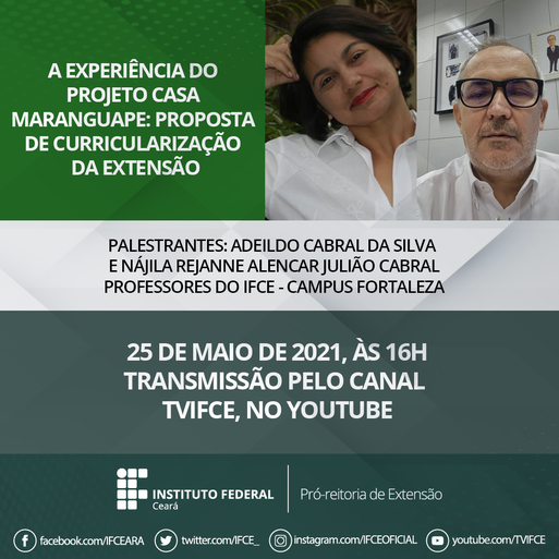 Gravação da palestra da Profa. Nájila Rejanne Alencar Julião Cabral e do Prof. Adeildo Cabral da Silva - Gravação da Quinta Trilha de Aprendizagem para a Curricularização da Extensão no IFCE: Experiências do Projeto Casa Maranguape: Proposta de Curricularização da Extensão.