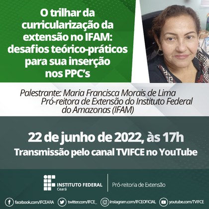 Gravação da palestra da Profa. Maria Francisca Morais de Lima - Gravação da Sexta Trilha de Aprendizagem para a Curricularização da Extensão no IFCE: O Trilhar da Curricularização da Extensão no IFAM - Desafios Teórico-Práticos para sua Inserção nos PPC's.