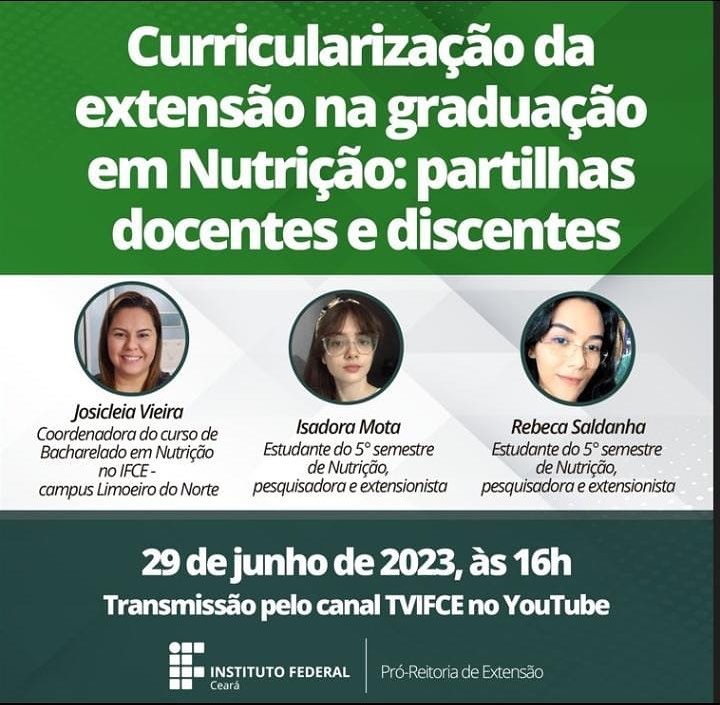 Gravação da Partilha dos Docentes e Discentes do Curso de Graduação em Nutrição - Gravação da Nona Trilha de Aprendizagem para a Curricularização da Extensão no IFCE: Curricularização da Extensão na Graduação em Nutrição - Partilhas Docentes e Discentes. Com as convidadas Profa Josicleia Vieira e das alunas Isadora Mota e Rebeca Saldanha.