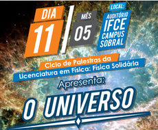 O Curso de Licenciatura em Física do campus de Sobral do IFCE realiza, na próxima quarta-feira, 11 de maio, uma edição especial do Ciclo de Palestras, com o tema "O Universo". O evento contará com parceria do Instituto Federal do Piauí (IFPI), que trará um grupo de alunos para o campus de Sobral.