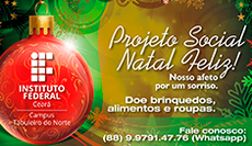 A solidariedade também se aprende em sala de aula. Até o dia 7 de dezembro, alunos do 1º ano do curso integrado em Petróleo e Gás estão promovendo o projeto “Natal Feliz”. A iniciativa é uma das atividades da disciplina de Projeto Social e Empreendedorismo, da professora Joceli Noronha, do IFCE, campus Tabuleiro do Norte. Podem ser doados alimentos, roupas e brinquedos. Todas as doações serão encaminhadas para comunidades da zona rural de Tabuleiro do Norte.