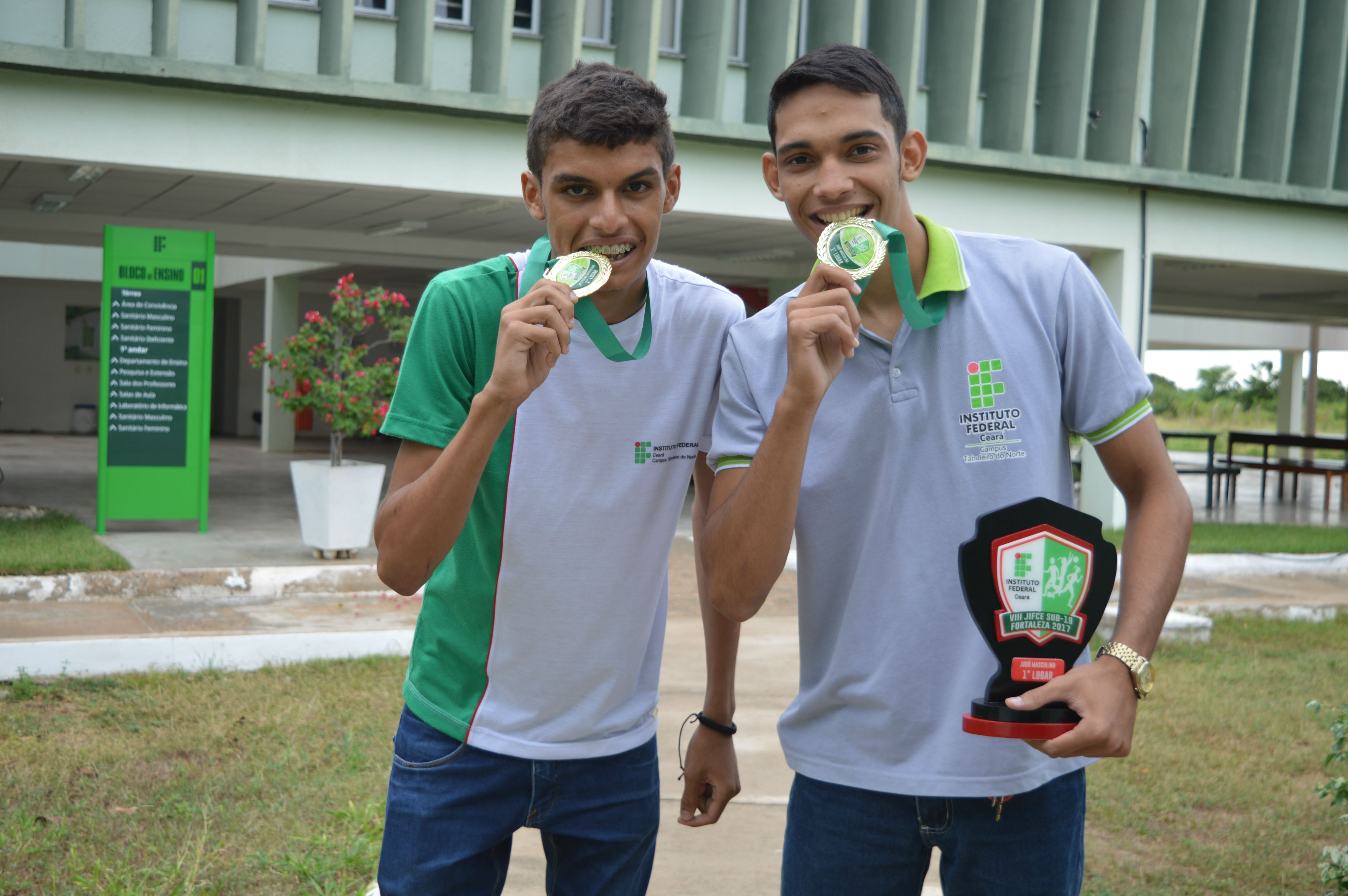 Estudantes Antônio José (e) e Lucas Cruz (d) conquistaram o primeiro lugar na disputa em salto em altura masculino e no judô categoria ligeiro 55kg até 60kg.