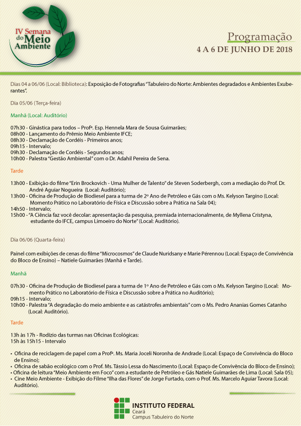 O Instituto Federal do Ceará (IFCE), campus Tabuleiro do Norte, realiza, a partir desta terça-feira, 5 de junho, a IV Semana do Meio Ambiente. Ao longo de dois dias, estudantes, professores e comunidade em geral poderão acompanhar palestras, oficinas, exposição fotográfica e outras atividades voltadas à temática ambiental.