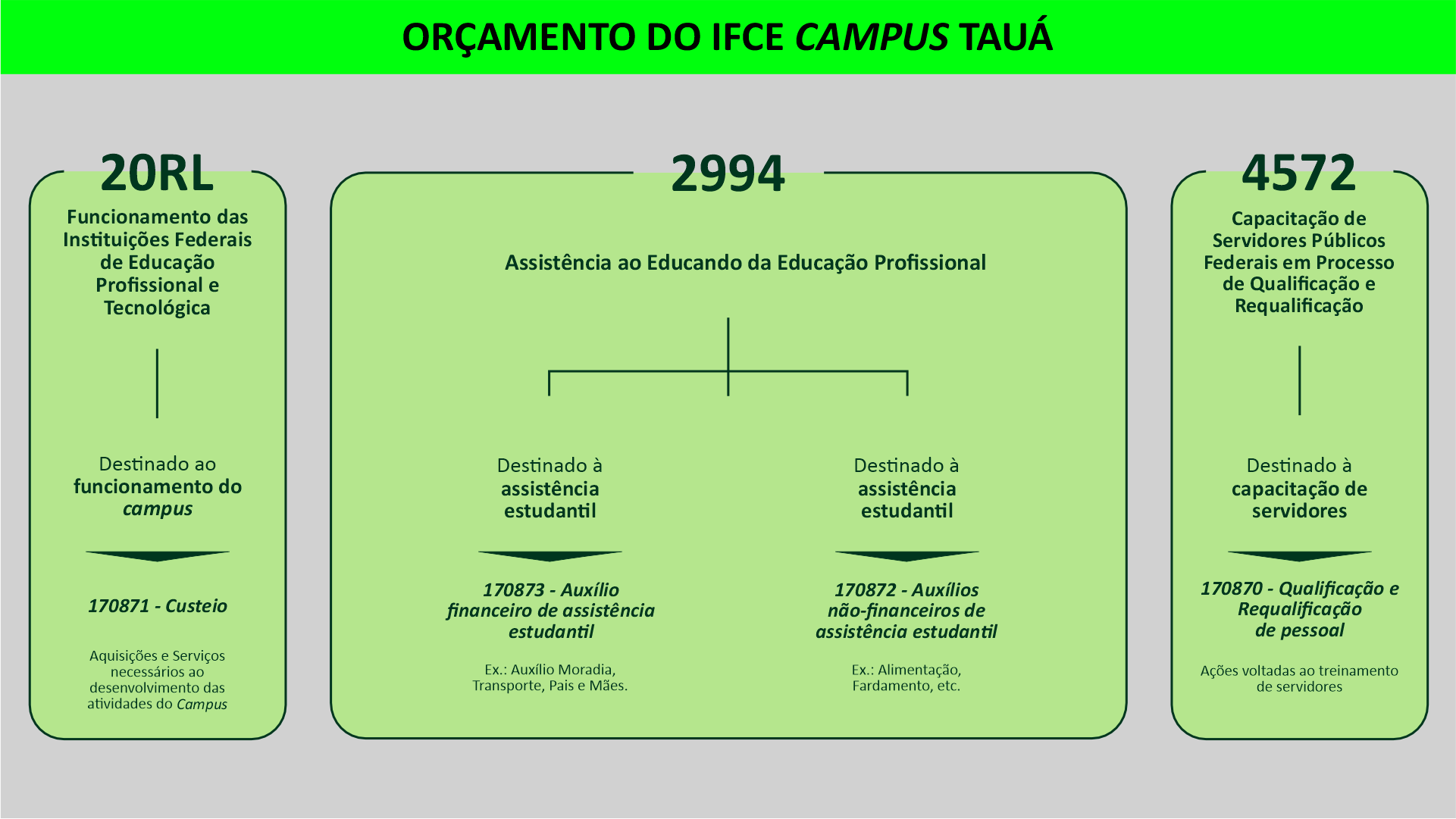 O Orçamento Anual do IFCE campus Tauá é recebido e alocado em "Ações Orçamentárias". Nessas "Ações Orçamentárias" são alocados os recursos para que um programa de governo seja atendido, com o objetivo de atender necessidades de uma certa área de atuação, no caso do IFCE, a área de atuação é a Educação.