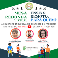 A mesa-redonda terá participação de Geísa Paixão, fonoaudióloga do Integrar Centro Multidisciplinar (ICM), e de Geandra Claúdia, professora da Universidade Estadual do Ceará (UECE). A mediação será do professor de educação física e coordenador do NAPNE do campus, Jayme Félix. Segundo ele, a proposta é "envolver os diversos atores do processo de ensino-aprendizagem da cidade de Tauá e região e refletir sobre que caminhos tomar em relação ao ensino remoto", levando em consideração as dificuldades que as pessoas com deficiência têm tido nesse contexto.