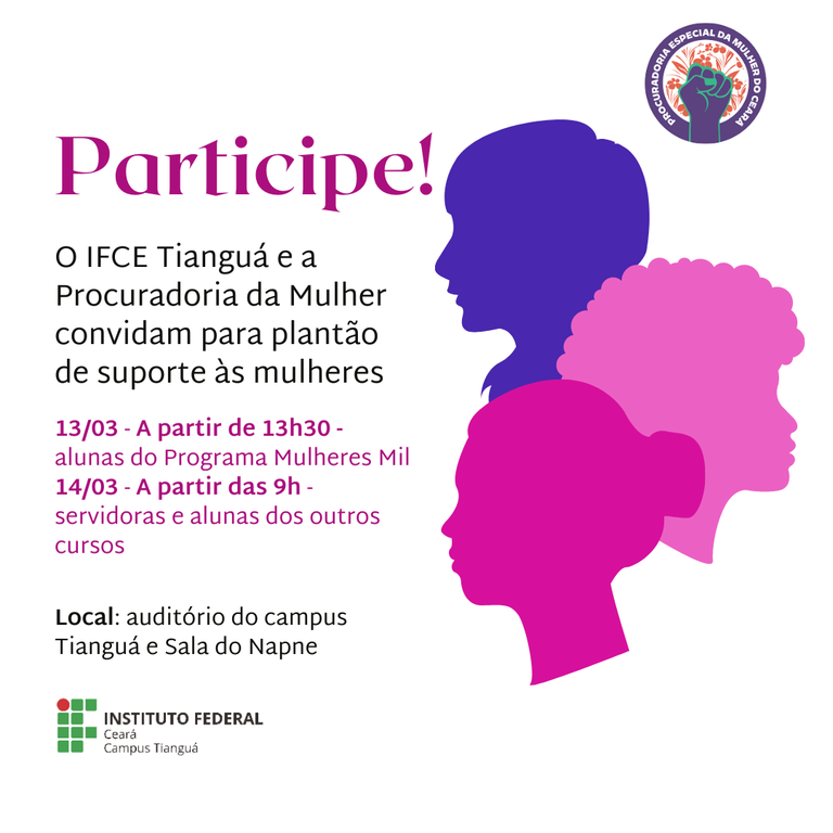IFCE Tianguá e Procuradoria da Mulher promovem evento nos dias 13 e 14/03