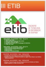 O IFCE Tianguá promoverá o III Encontro de Tecnologia da Informação da Ibiapaba (ETIB) nos dias 18 e 19 de outubro com o tema "Desenvolvimento Móvel, Jogos Digitais e Empreendedorismo". O evento contará com palestras e minicursos que versam sobre o universo das tecnologias (Tendências da Tecnologia na sua Carreira Profissional; Desafios e Sucesso no Desenvolvimento de Jogos; Framework para uso de Reconhecimento de Padrões em Python e Apple Academy e a visão do mundo IOS).