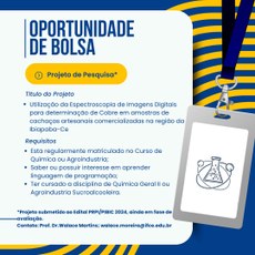 1. Utilização da Espectroscopia de Imagens Digitais para determinação de Cobre em amostras de cachaças artesanais comercializadas na região da Ibiapaba-CE. Com este projeto, os estudantes selecionados terão a oportunidade de trabalhar com tecnologia de ponta e desenvolver habilidades práticas sob a temática;
