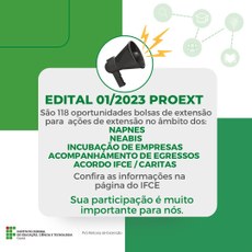 A Coordenadoria de Pesquisa e Extensão do IFCE campus Ubajara (CPE) divulga o Edital Nº 1 da Pró-Retoria de Extensão/Reitoria - IFCE, que regulamenta a seleção de bolsitas entre os discentes regularmente matriculados nos cursos de nível técnico e de graduação dos Institutos Federais do Ceará, para atuação no Programa de Acompanhamento de Egressos, na Incubação de Empresas, nos Núcleos de Acessibilidade às Pessoas com Necessidades Específicas (Napnes), nos Núcleos de Estudos Afrobrasileiros e Indígenas (Neabis), bem como, nos projetos advindos do Acordo de Cooperação entre IFCE e Cáritas Brasileira Regional Ceará.