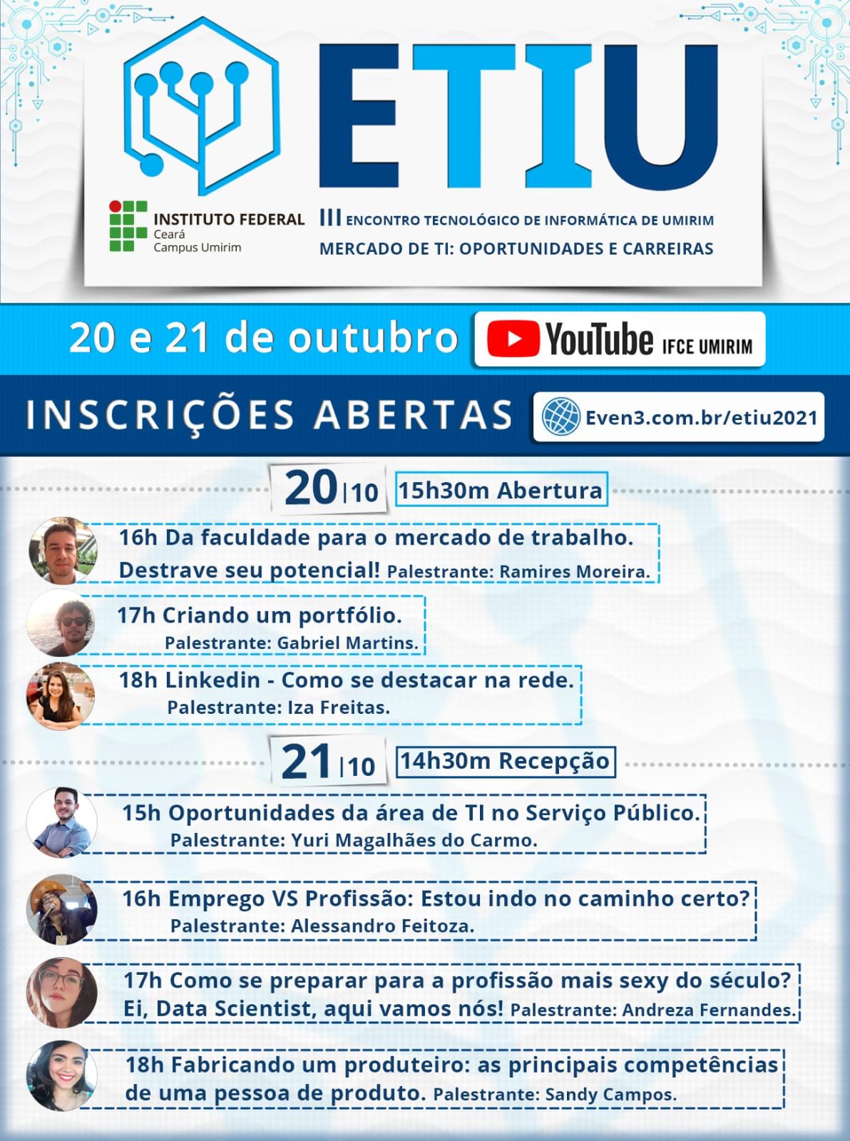 É com grande satisfação que anunciamos a realização do III ETIU (Encontro Tecnológico de Informática de Umirim). Este ano o evento terá como tema principal: MERCADO DE TI - OPORTUNIDADES E CARREIRAS, e será realizado nos dias 20 e 21 de outubro de forma on-line pelo canal do YouTube IFCE Campus Umirim.